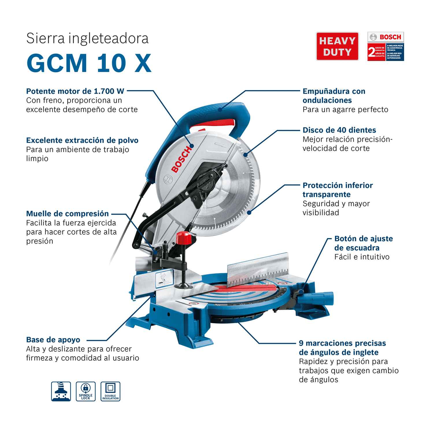 La Sierra de Inglete Bosch GCM 10 X, con potencia de 1.700 W, combina el máximo de calidad de corte con la eficiencia en un diseño ergonómico. Cuenta con freno del motor y bisagra reforzada para mayor durabilidad. El sistema de cambio de escobillas de carbón es práctico y las piezas tienen bajo nivel de desgaste, garantizando así, mayor vida útil de la herramienta. Además de esto, obtenga más precisión con el resorte de compresión y el tornillo ajustable para cortes de ranuras, además de 9 marcas de ángulo. Lista para usar, la Sierra de Inglete Bosch GCM 10 X viene con 1 disco de 40 dientes, 1 llave, 1 bolso colectora de polvo y 1 sargento. Es indicada para uso industrial y tiene sello Heavy Duty con 2 años de garantía.