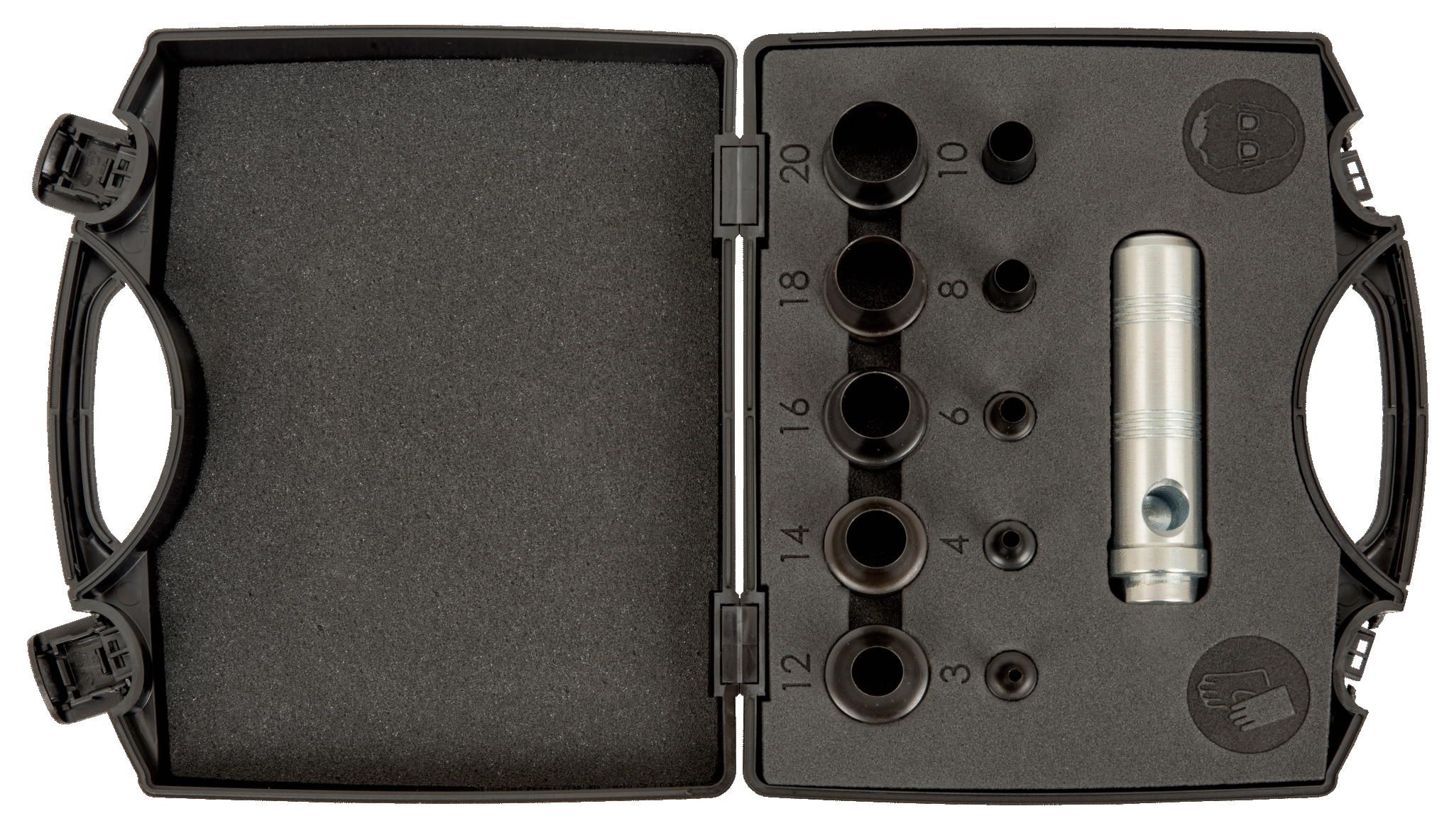 - Diámetros de boca: 3 mm, 4 mm, 6 mm, 8 mm, 10 mm, 12 mm, 14 mm, 16 mm, 18 mm, 20 mm