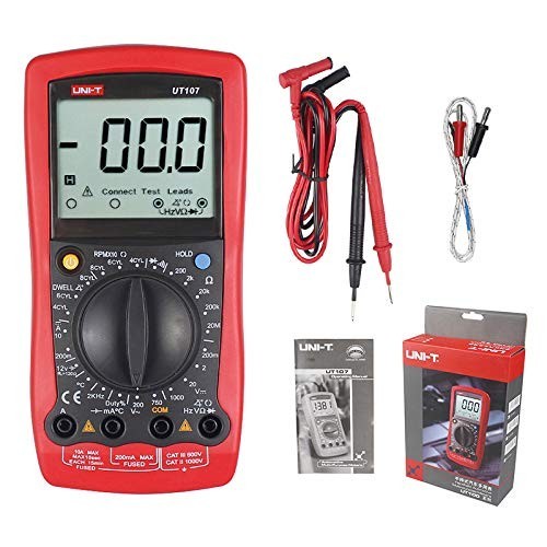 UNI-T UT107 es un multímetro digital diseñado para talleres automovilísticos. Permite medir corriente DC, voltaje AC/DC, resistencia, frecuencia, temperatura, velocidad de rotación del cigüeñal, realizar chequeo de diodos y probar continuidad de circuitos.