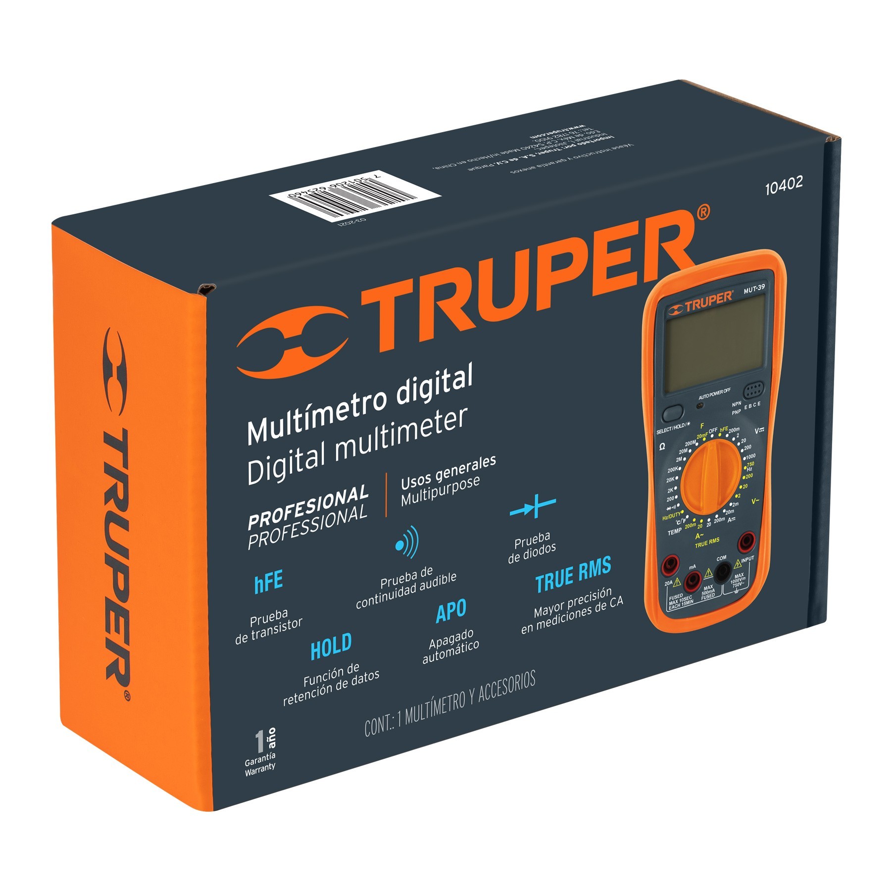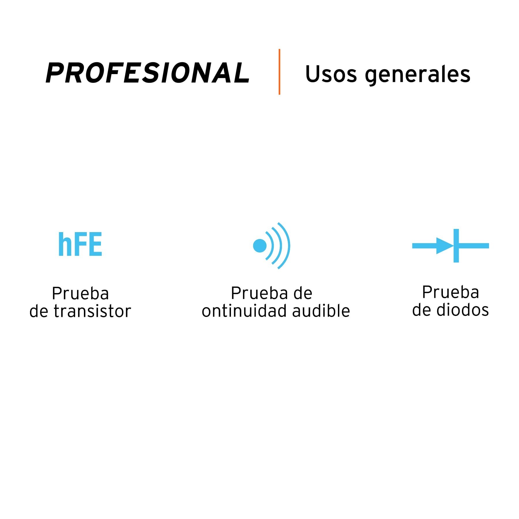 - Funciones: Prueba de continuidad audible, diodo, transistor NPN o PNP (0-1,000 B), Mayor precisión en mediciones de CA (True RMS) y Sistema de auto apagado (APO)