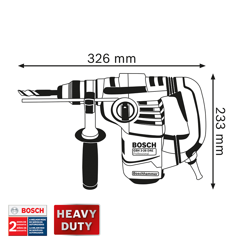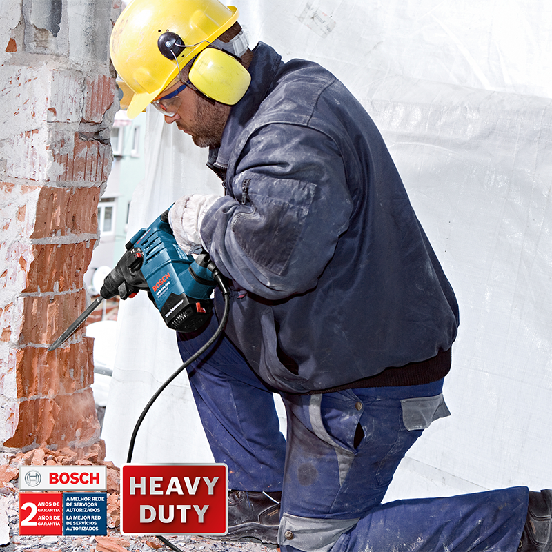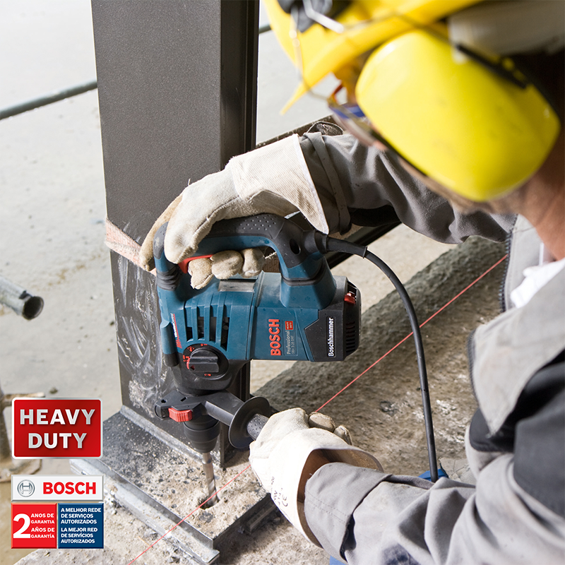 El Martillo Perforador y Demoledor Bosch GBH328 DRE tiene el mejor rendimiento de ruptura de la clase. Con motor de 800W y sistema de cambio rápido de accesorios SDS-Plus, es ideal para trabajos pesados en la construcción civil, reformas, instalaciones en general y ofrece un óptimo rendimiento de perforación en hormigón, en diámetros de 18 a 28mm. Robusto y compacto, su manipulación es cómoda, con empuñadura en “L” es seguro, ya que trae el sistema de reducción de vibraciones y embrague de seguridad, protegiendo al operador en caso de trabado del accesorio.