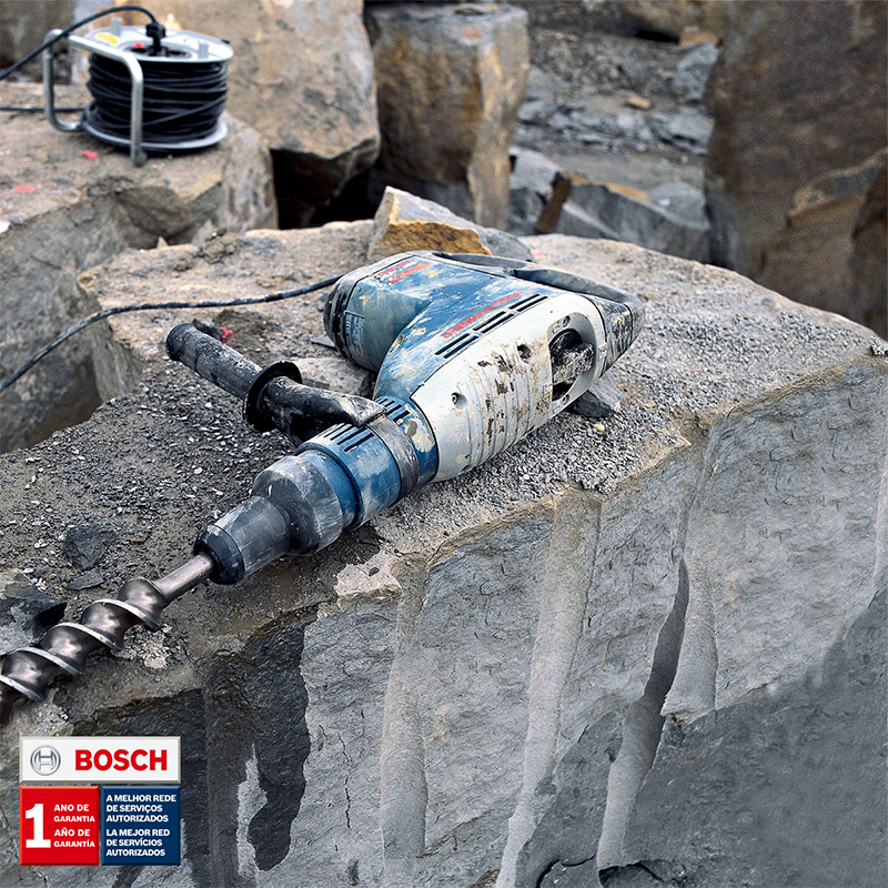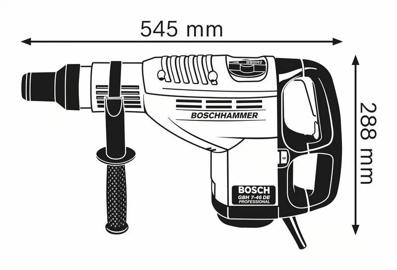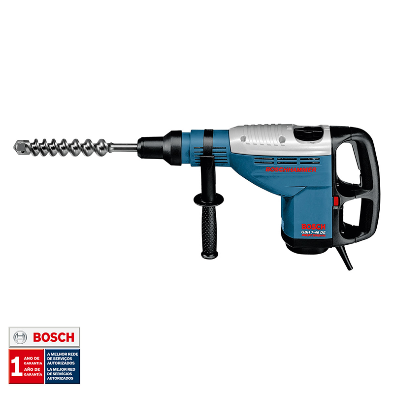 Martillo perforador Bosch GBH 7-46 DE (0.611.263.703) es el martillo más fuerte de su clase gracias al potente motor de 1.350 W. Tiene un mayor arranque al cincelar gracias al Turbo-Power con hasta 15 J de energía de impacto y una larga vida util, reconocible por sus robustos componentes de metal. Otras ventajad son el mejor confort de uso gracias al ajuste individual del número de revoluciones, al conmutador con bloqueo en la función de picador y a la nueva empuñadura adicional ergonómica.