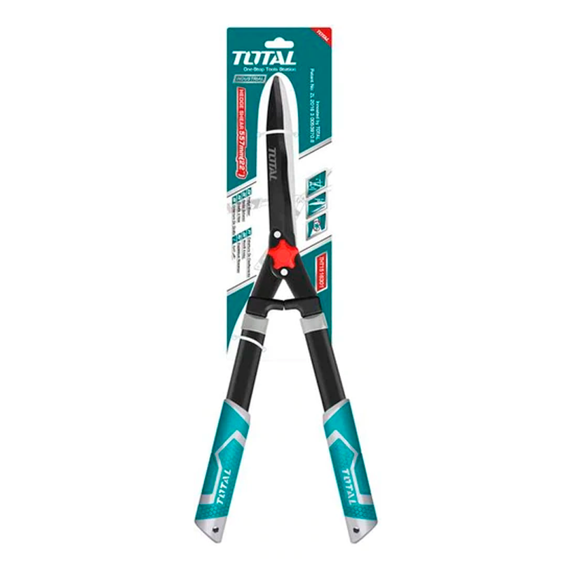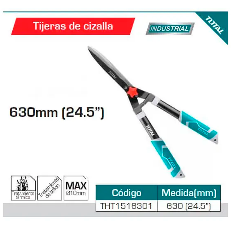 Tijera para cortar pasto 24.5” (630MM), fabricada en acero al carbono. Sus cuchillas de tratamiento térmico poseen un acabado en teflón, son ajustables y duraderas. Posee 2 empuñaduras de goma blanda. Colgador.